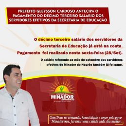 O prefeito de Minador do Negrão, Gleysson Cardoso (MDB), realizou pagamento na última sexta-feira (28), do 13º salário dos servidores públicos efetivos da educação do município em 40% e 60%. Os valores já estão disponíveis para saque e com o pagamento foram injetados recursos na economia local.