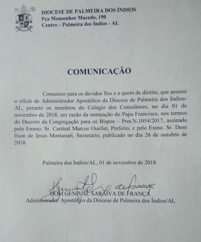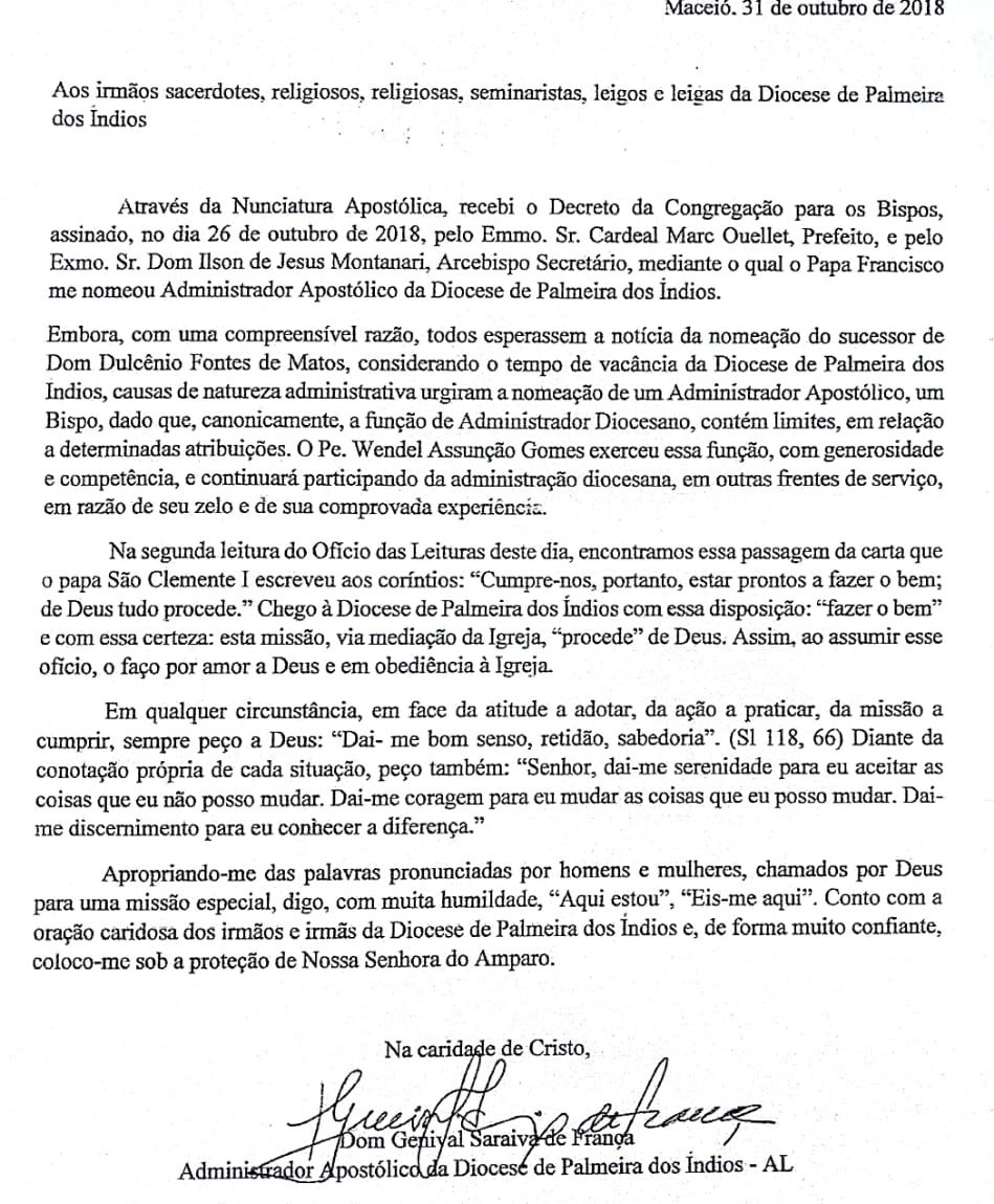 Ao estimado irmão, Dom Genival Saraiva de França, ao Clero e fiéis da estimada Diocese de Palmeira dos Índios,