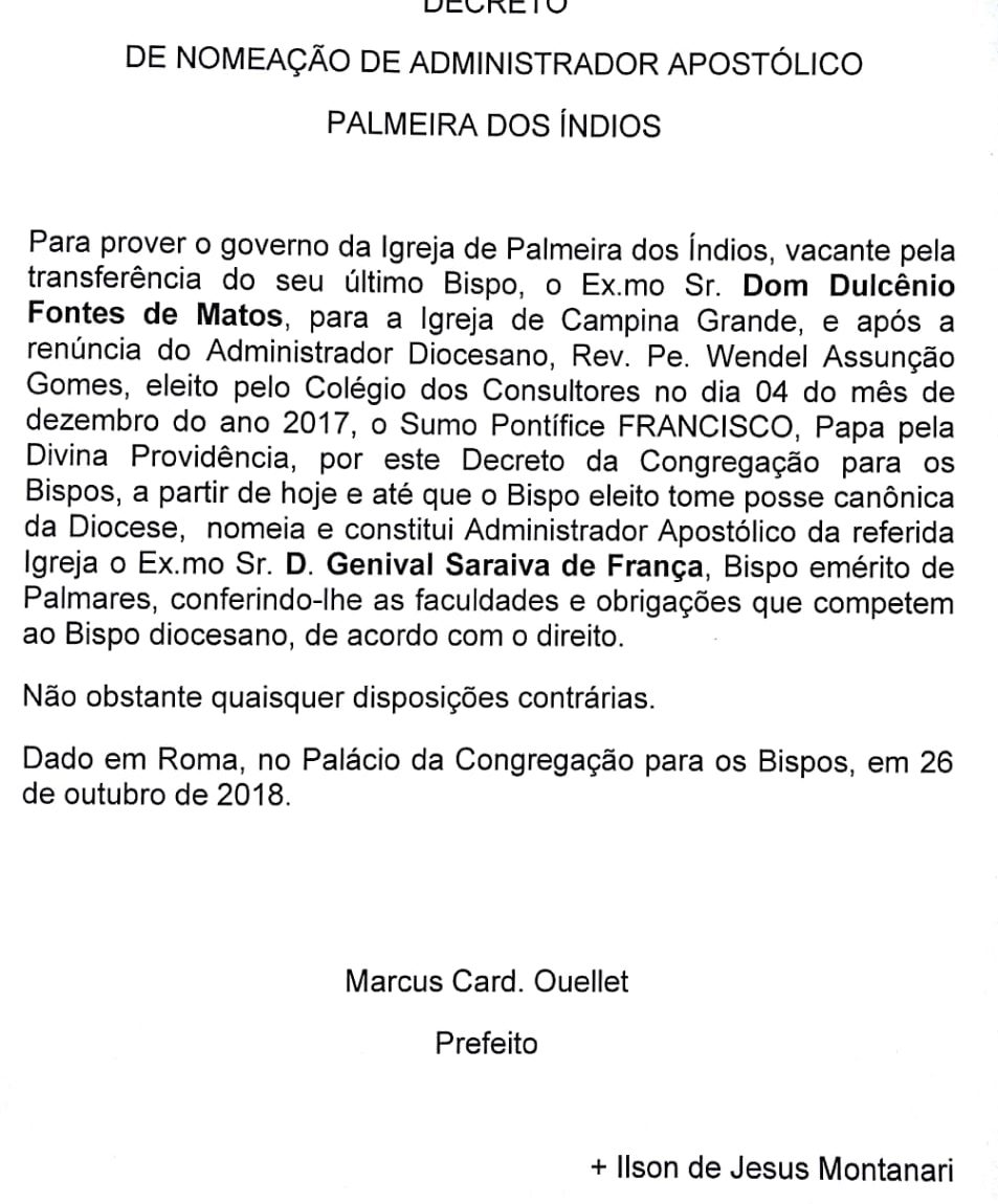 O Papa Francisco nomeou Dom Genival Saraiva de França, Administrador Apostólico da Diocese de Palmeira dos Índios.