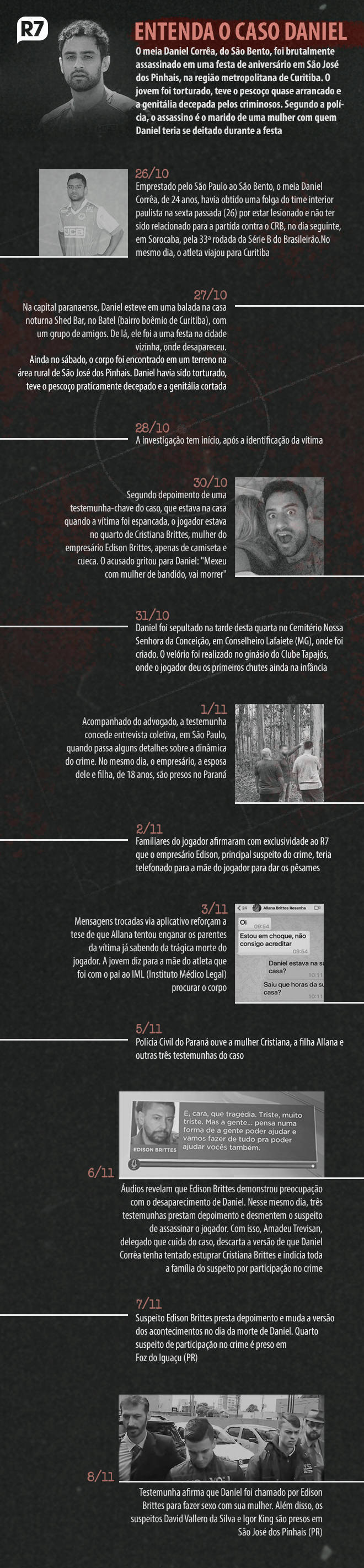 Depois, Brittes teria ido até a cozinha e pegado a faca usada para matar e cortar o órgão genital de Daniel. Antes de retornar ao carro, ele ainda teria afiado a faca no chão. David Vallero e Ygor King teriam visto tudo o que aconteceu. Nenhum dos três suspeitos foram ameaçados por Edison para acompanhá-lo no assassinato do atleta.