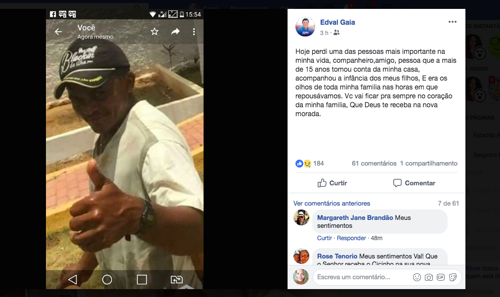 Nas redes sociais, Edval Gaia lamentou a morte do vigilante. “Hoje perdi uma das pessoas mais importantes na minha vida. Companheiro, amigo, pessoa que a mais de 15 anos tomou conta da minha casa, acompanhou a infância dos meus filhos, e era os olhos de toda minha família nas horas em que repousávamos. Vc vai ficar pra sempre no coração da minha família, Que Deus te receba na nova morada”, escreveu Val Gaia.