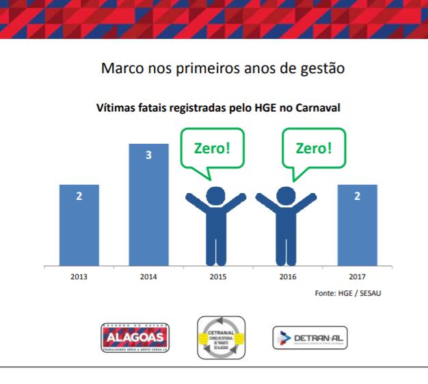 O Departamento Estadual de Trânsito de Alagoas (Detran) em parceria com o Conselho Estadual do Trânsito (Cetran) apresentou na manhã desta sexta-feira (01) os dados estatísticos do carnaval dos últimos anos e a campanha educativa 2019 que tem o tema “a segurança de todos é a nossa alegria”. De acordo com os dados, de 2014 a 2018 houve uma redução de 32% em relação ao número de óbitos causados por acidentes de trânsito em Alagoas.