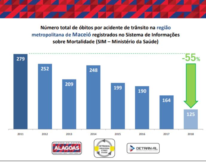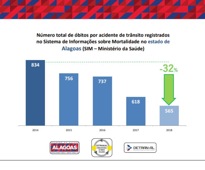 Conforme mostram as estatísticas abaixo apresentadas pelo presidente do Cetran, Antônio Tenório, em 2017 houve 618 óbitos causados por acidentes de trânsito. Em 2018, foram 565 mortes em Alagoas.