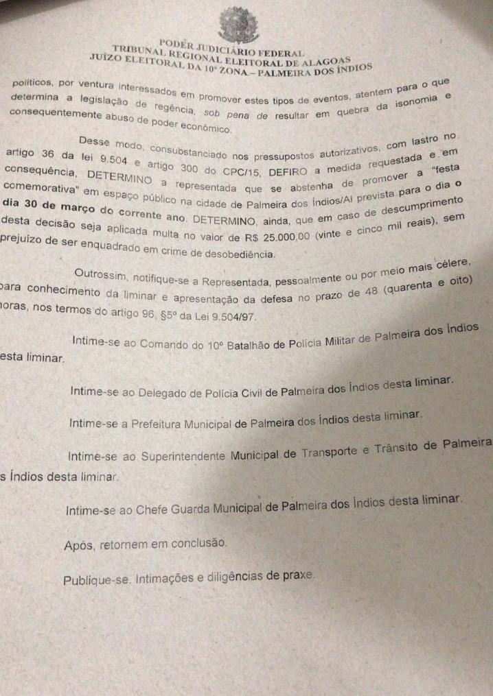 O MP Eleitoral, entrou com representação solicitando o cancelamento por meio da Justiça Eleitoral. O juiz eleitoral José Miranda dos Santos Júnior, que concedeu a liminar cancelando a festa, destacou que ficou configurado “propaganda eleitoral extemporânea”.