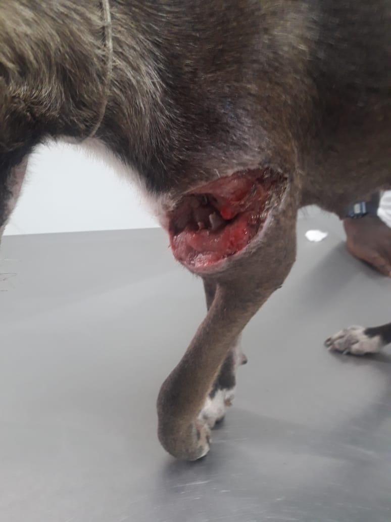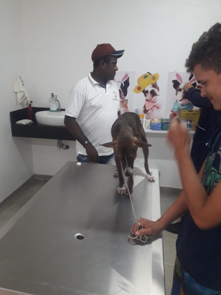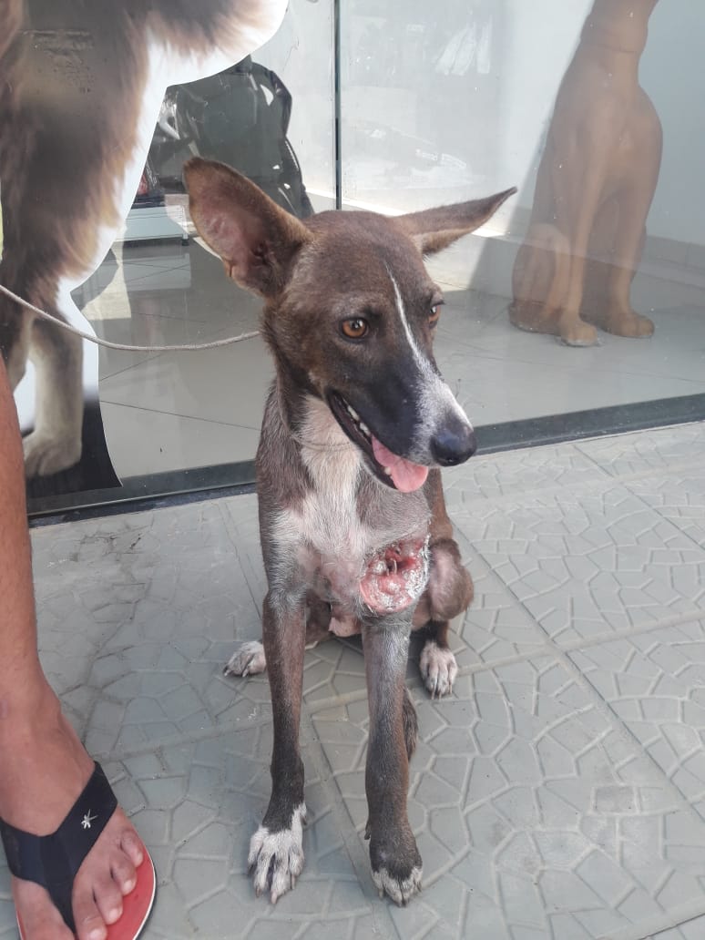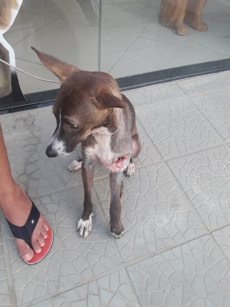 O animal foi resgatado pela APAPI, e levado a um consultório veterinário onde passa por uma triagem para fazer cirurgia reparatória.