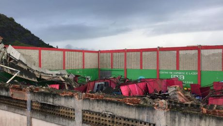 A cobertura e as pilastras de sustentação do Centro de Esporte e Lazer Wilton Fragoso, que está abrigando temporariamente a Escola Municipal Rainha da Paz, foram destruídas. O vídeo acima, cedido ao G1 pelo jornalista Higor Silva, mostra como ficou o local.