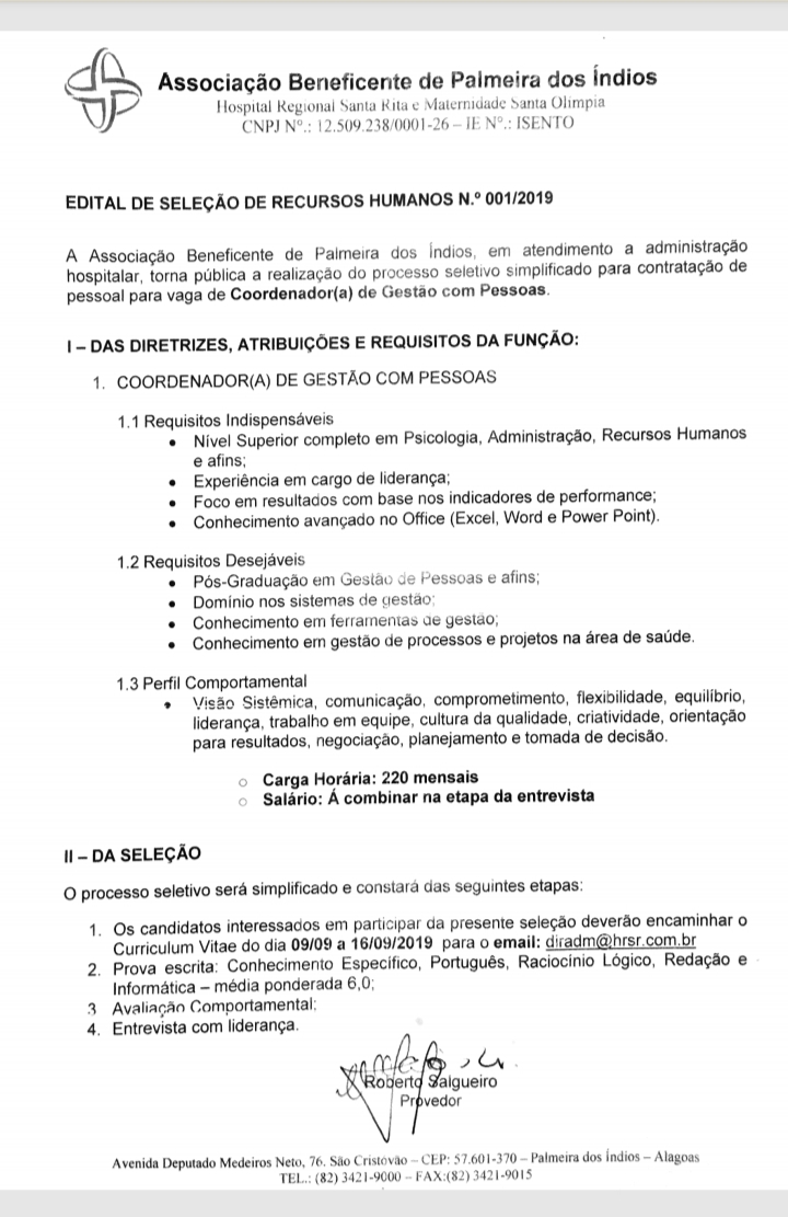 O Hospital Santa Rita e Maternidade Santa Olímpia, em Palmeira dos Índios/AL, lança edital para realização do Processo Seletivo Simplificado para a contratação de pessoal para vaga de Coordenador (a) de Gestão com Pessoas.