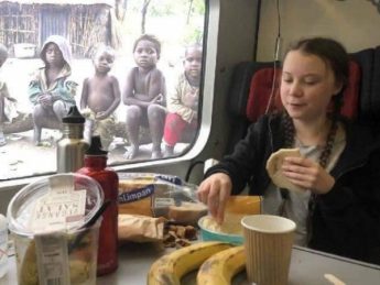 Eduardo postou uma montagem onde Greta encontra-se em um vagão de trem e, do lado de fora, crianças em situação de miséria observam a garota com olhar triste. No entanto, na foto original, existe apenas um fundo com uma floresta