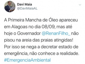 “A primeira mancha de óleo apareceu em Alagoas no dia 08/09, mas até hoje o governador Renan Filho não pisou na areia das praias atingidas! Por isso, nega-se a decretar estado de emergência. Não conhece a realidade”, reagiu o parlamentar nessa quarta-feira, em uma publicação no seu perfil no Twitter. Davi Maia já chegou a reunir os órgãos ambientais que estão atuando nas praias e pediu que o governo estadual faça “muito mais”.