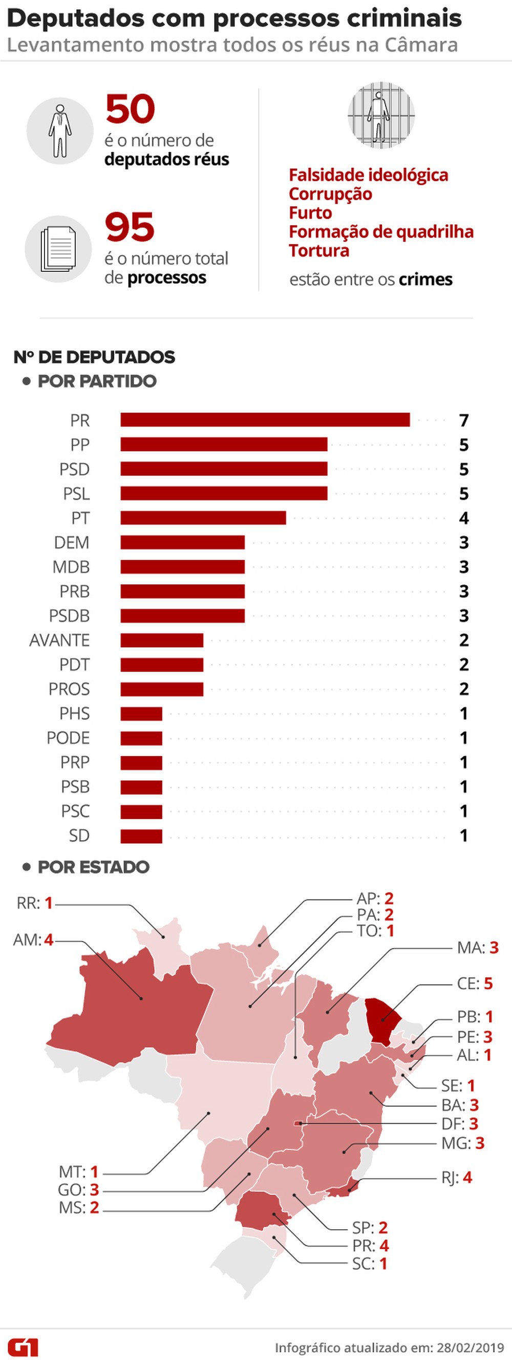 Levantamento feito pelo G1 mostra que 50 deputados federais respondem hoje a processos criminais na Justiça. O dado representa 10% do total de parlamentares na Câmara (513). São, ao todo, 95 processos – apenas um dos deputados responde a 30 ações (quase 1/3 do total).