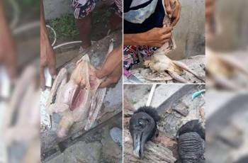 É possível ver as aves sendo depenadas e as cabeças ao lado. A carne do urubu estaria sendo vendida ao preço “promocional” de R$ 5, o quilo. Os urubus foram capturados com linha de pesca e anzóis com isca, segundo a publicação.
