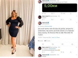 “Pra você! Tenho nem 40 dias de parida, sempre fui sedentária, não tenho dormido direito e tô fazendo dieta restrita. TÁ POUCO PRA VOCÊ, BB! PRA MIM TÁ TUDO!”, afirmou.
