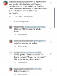 “Bom e a prefeitura que ainda não divulgou os 61 casos confirmado do coronavírus no Recife e uma upa fechada vamos lá prefeito conta a realidade pra quem brincou o carnaval (SIC)”, disse o internauta. Questionado por outro usuário sobre a fonte desta informação, ele respondeu apenas que trabalhava na área de saúde.