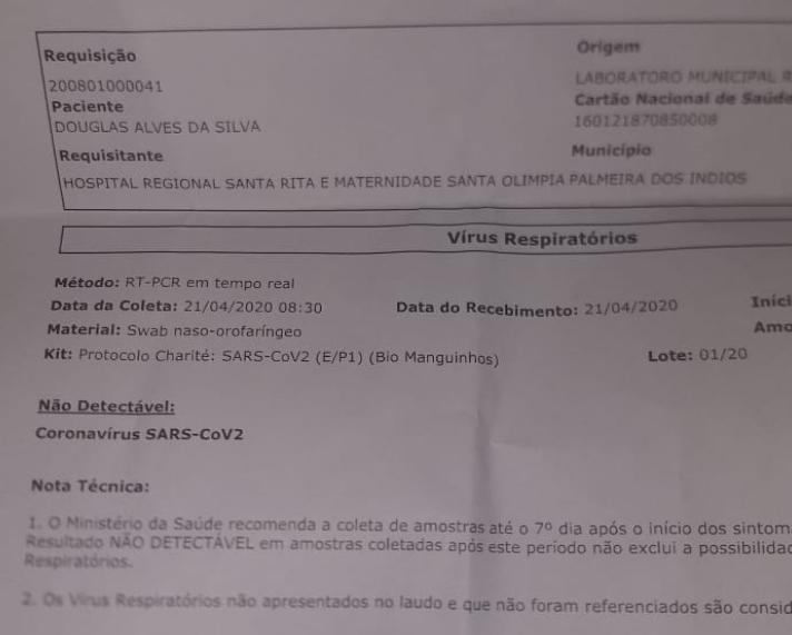 Apesar de ter sido notificado como morte suspeita para covid-19 depois do óbito em 21 de abril, o resultado testou negativo.