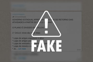 “Governo Estadual apresenta o plano de retorno das atividades a partir do dia 11 de maio. O plano é dividido em ciclos: 1° ciclo: Início dia 14 de Maio. Lojas de artigos esportivos e afins; Lojas de artigos para casa; Lojas de vestuário, acessórios, calçados e afins; Lojas de móveis e colchões; Joalherias e relojoarias”, diz trecho da mensagem.