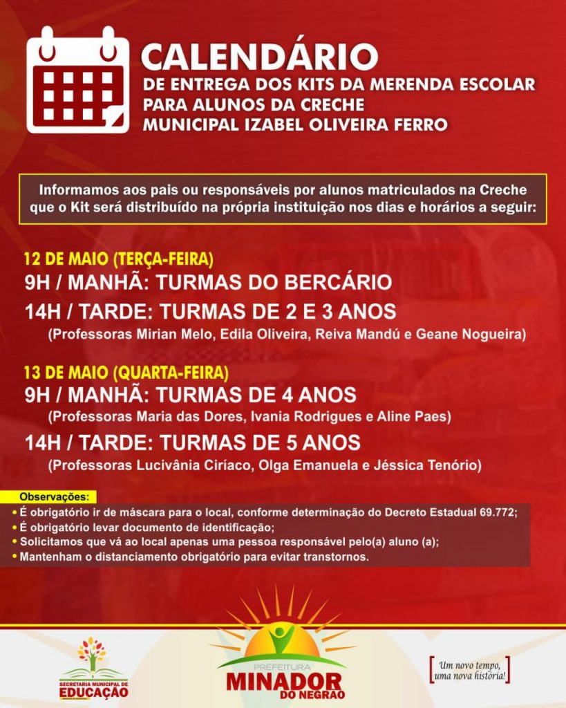 Na última quarta-feira (13), a Prefeitura de Minador do Negrão concluiu a entrega dos kits da alimentação escolar, para alunos da Creche Municipal Izabel Oliveira Ferro.