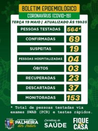 A Prefeitura de Palmeira dos Índios, por meio da Secretaria Municipal de Saúde (SMS), mantém atualizadas as últimas notícias sobre o coronavírus e informa que o município tem 69 pessoas infectadas e outras 19 suspeitas de terem contraído a doença. Nesta terça (19), a Vigilância em Saúde notificou mais dois casos positivos.