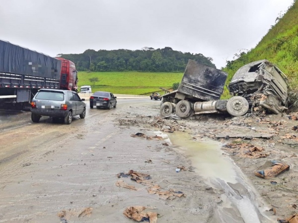 De acordo com informações repassadas pela Polícia Rodoviária Federal (PRF), o acidente envolveu dois caminhões. Um dos condutores perdeu o controle do veículo e ficou atravessado na rodovia. Na sequência, outro caminhão bateu no barranco e na traseira do outro veículo.