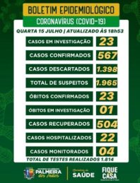 A Vigilância em Saúde informa que, até hoje, 40 casos estão sendo monitorados, 567 foram confirmados, 23 são suspeitos, 1.398 descartados, 23 óbitos confirmados, 22 pessoas hospitalizadas e 1.814 testes realizados.