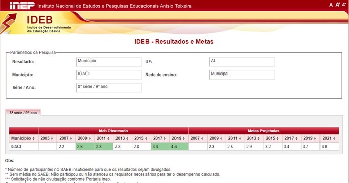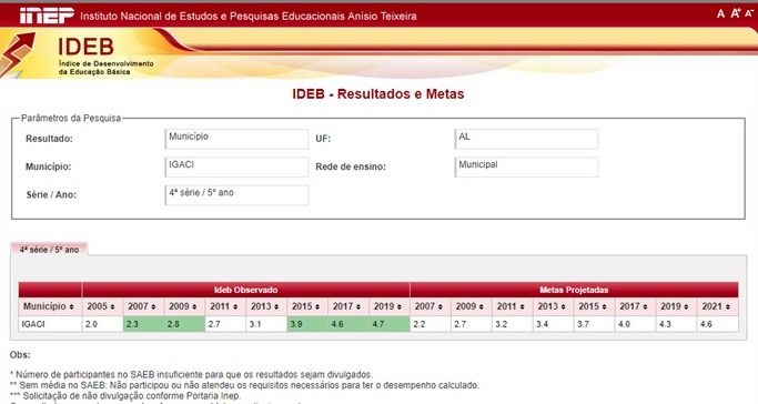 Os dados mostram, também, que Igaci vem batendo a meta estabelecida pelo Ideb, nos anos iniciais da grade para 2019, como bateu a meta projetada para 2021, alcançando 4.6.