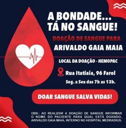 Para doar, precisa procurar o HEMOPAC, no Farol, em Maceió, e dizer que o sangue é destinado a Arivaldo Maia Gaia, no Centro de Tratamento da Medradius.