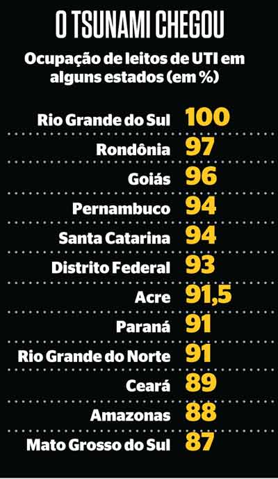Em todas as regiões a situação se agrava. Várias capitais enfrentam colapso e ultrapassam a marca de 100% dos leitos de UTI ocupados. Hospitais viraram campos de guerra. Em Porto Alegre, os médicos passaram a escolher os pacientes com mais chances de sobreviver. Os hospitais privados de referência de São Paulo também atingiram a capacidade máxima. Imagens de funcionários horrorizados com as mortes e os dramas que enfrentam, impotentes, se multiplicam. “Estou triste, a população errou, os governantes erraram”, desabafa a médica Ilana Debarba Nedeff que atua em uma Unidade Básica de Saúde em Camboriú (SC). “Cheguei a um nível de exaustão física e mental enorme. Já tomava medicação antidepressiva e precisei aumentar a dose, senão não ia aguentar”, afirma. É impossível não se emocionar diante da tragédia que se repete em todo o País. É o que aconteceu com o governador baiano Rui Costa, no dia 1º, ao pedir que os cidadãos respeitassem as regras de isolamento. “Quantas vidas vale uma bebedeira?”, indagou o governador aos prantos. “Teremos as duas semanas mais duras e graves da pandemia. Serão as mais trágicas e difíceis para todos os estados brasileiros”, resumiu o governador João Doria, que colocou o estado de São Paulo na fase vermelha (apenas serviços essenciais funcionam e há restrição de circulação a partir das 20h).