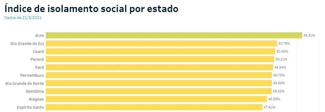 Já neste sábado (20), o percentual foi de 43,4%. Alagoas, no dia, ficou em oitavo lugar no ranking de distanciamento social do país, atrás dos estados de Acre, Ceará, Amapá, Pará, Pernambuco, Rondônia e Piauí.