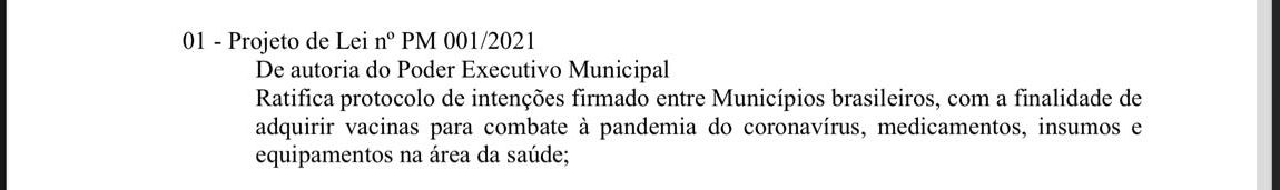 Em resposta a urgência que pede o Projeto de Lei (PL) número 01/2021, que solicita a aprovação para a compra de vacinas contra a Covid-19, foi votado por unanimidade em uma sessão extraordinária a aprovação da aquisição de vacinas para o município.