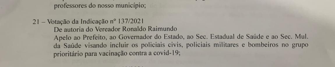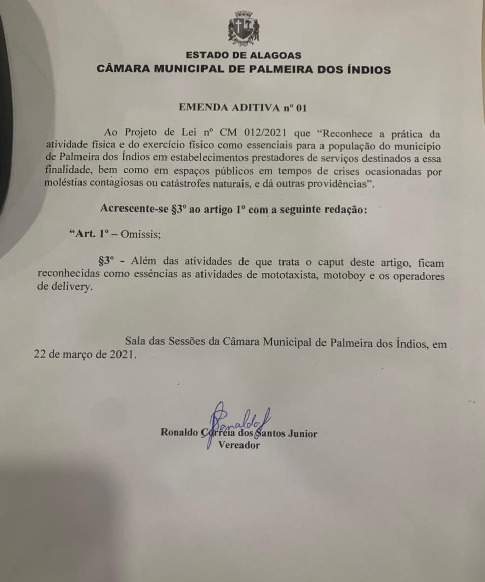 Reconhecer a prática de atividades físicas como essenciais em academias e espaços públicos, assim como a profissão de mototaxy, motoboy e operadores de delivery, e a concessão de auxílio aos comerciantes para assegurar-lhes os empregos e evitar colapso no comércio local, além da inclusão de policiais civis, militares e bombeiros no grupo prioritário da vacinação, foram quatro iniciativas do vereador e presidente da Casa, Ronaldo Raimundo (PSL), aprovadas, em sessão desta quarta-feira, 24, pela Câmara Municipal de Palmeiras dos Índios. Todas as proposições do presidente do Legislativo palmeirense visam a tentar diminuir os prejuízos causados pela pandemia de Covid-19 em diversos segmentos em Alagoas, e Palmeira não é diferente.