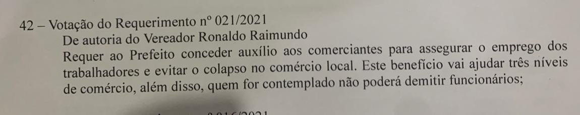 Ronaldo Raimundo propõe criar auxílio emergencial para comerciantes e reconhecer outras atividades essenciais em Palmeira