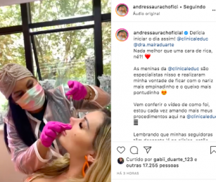 Esbanjando felicidade, a gata surgiu com um aspecto mais jovem. Em um vídeo que mostra seu antes e depois, Andressa legendou: “Nada melhor que uma cara de rica, né?! As meninas da @clinicaleduc são especialistas nisso e realizaram minha vontade de ficar com o nariz mais empinadinho e o queixo mais pontudinho”.