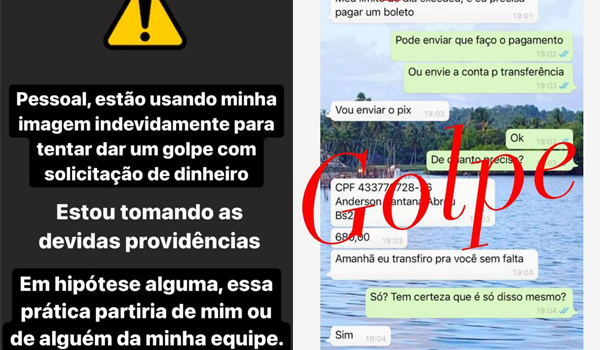 Através dos stories do Instagram, o parlamentar divulgou uma foto em que mostra uma conversa entre o suspeito e uma vítima. Nas mensagens, o suspeito diz que excedeu o limite e que precisa realizar o pagamento de um boleto.