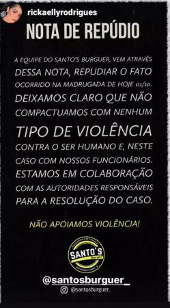 A mãe do funcionário, que é atendente na lanchonete, presenciou as agressões. Ela aparece desesperada nas imagens. A lanchonete divulgou uma nota de repúdio e cobrou que o agressor seja responsabilizado. Os dois funcionários agredidos disseram que vão prestar queixa no sábado (2).