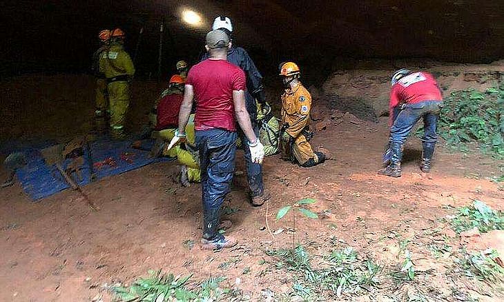 Assim que o acidente foi confirmado, por volta das 3h, bombeiros e policiais da região e de Minas Gerais (a cidade fica próxima da divisa com o estado) foram enviados para ajudar no resgate. A chuva forte e a dificuldade de acesso para chegar até a gruta, que fica no final de uma trilha de 1,5 km, atrapalhou o trabalho.