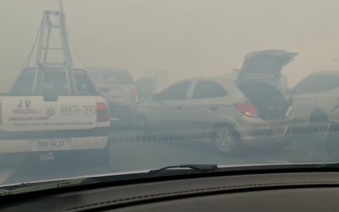 Testemunhas gravaram vídeos que mostram muita fumaça no terreno às margens da rodovia. Nas imagens também é possível ver entre os veículos envolvidos no engavetamento carros de passeio, uma van e até uma ambulância municipal. Não há informações se algum paciente era transferido no momento.