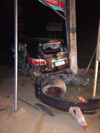Um carro teve sua lateral destruída após colidir com um poste, durante a madrugada desta sexta-feira (19). O acidente aconteceu na Rodovia AL-101 Norte, no município de Maragogi.