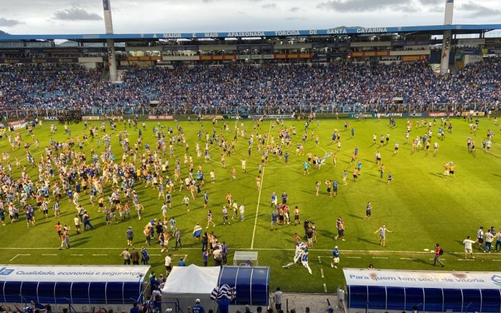 O Avaí está de volta à Série A! Com muita emoção, o Leão venceu o Sampaio Corrêa por 2 a 1, na Ressacada, diante de quase 16 mil torcedores pela 38ª rodada da Série B do Brasileiro. No fim do jogo, a torcida invadiu o campo para fazer a festa com os jogadores.