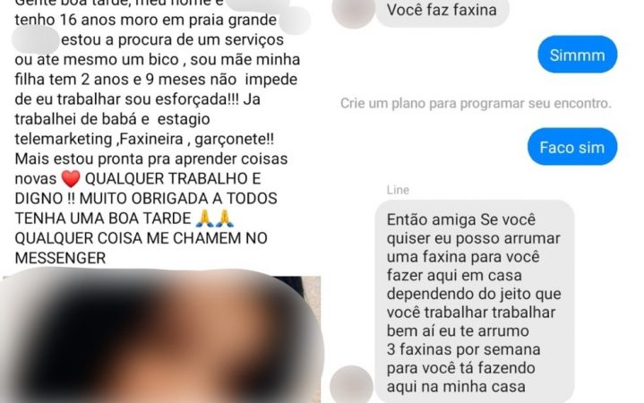Segundo a adolescente, que não quer ser identificada, ela tem uma filha de dois anos e está precisando de emprego. Por esse motivo, fez uma postagem nas redes sociais relatando que estava em busca de uma oportunidade, em qualquer função, incluindo atendente de telemarketing, faxineira ou babá.
