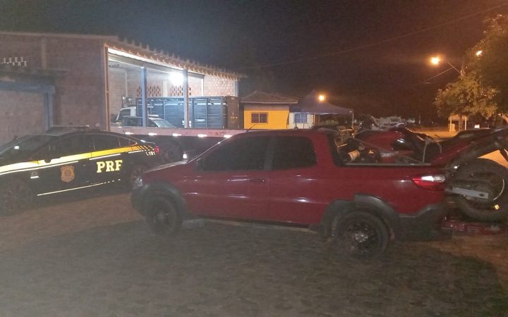 No bagageiro do carro, duas motocicletas, uma Honda/XRE, de cor vermelha, e uma Honda/CG, de cor preta e sem licenciamento, foram apreendidas