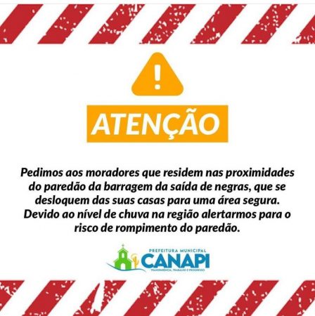 “Pedimos aos moradores que residem nas proximidades do paredão da barragem da saída de Negras, que se desloquem das suas casas para uma área segura. Devido ao nível de chuva na região, alertamos para o risco de rompimento do paredão”, diz o comunicado.