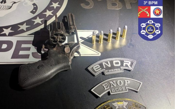 Na abordagem, a guarnição do Pelotão de Operações Especiais (Pelopes) 01 juntamente com equipe da Rondas Ostensivas com o Apoio de Motocicletas (Rocam) apreenderam um revólver Taurus, cal .38, e 5 munições intactas encontradas na cintura do suspeito.