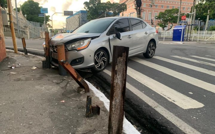 Após ser ‘trancado’ por moto, veículo colide em mureta de proteção no Centro