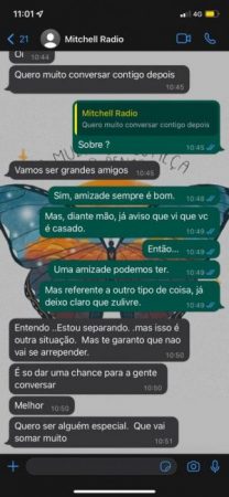 Diante da afirmação da jovem, o radialista e informou que estava se separando. “Entendo.. Estou separando. Mas isso é outra situação. Mas te garanto que não vai se arrepender. É só dar uma chance pra gente conversar melhor. Quero ser alguém especial. Que vai somar muito”, falou o radialista através de mensagens de texto, via WhatsApp.