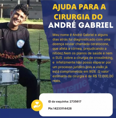 Amigos do jovem André Gabriel, de 19 anos, estão realizando uma campanha na internet com a finalidade de angariar fundos após André ter sido diagnosticado com uma síndrome rara nos olhos e precisar passar por uma cirurgia no valor de R$ 12 mil. O jovem já realizou uma série de exames e corre o risco de perder a visão.