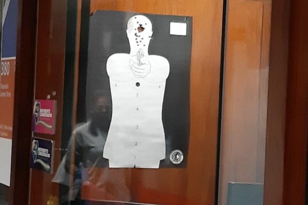 Quem passa por seu gabinete, o de número 380, no Anexo 3 da Câmara, avista um alvo desses de stand de tiro (como mostra a foto acima), algo muito em voga no governo de Jair Bolsonaro. E com muitas perfurações de disparos na região da cabeça.