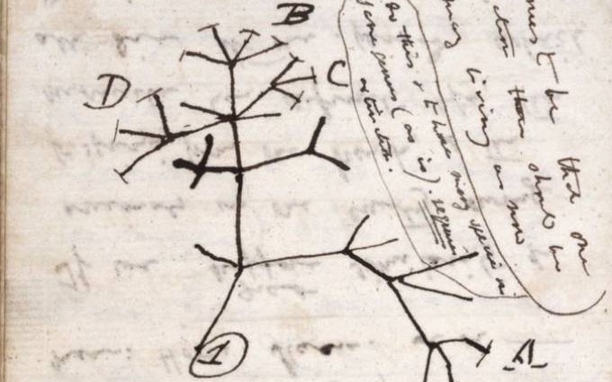 É nesse contexto que, praticamente pensando no papel, ele esboçou no “Caderno B” um diagrama que acabaria se tornando um dos ícones da biologia evolucionista. No alto da página, Darwin escreveu simplesmente “I think” (“Eu acho”) e, embaixo, uma estrutura semelhante ao tronco e aos galhos de uma árvore em constante ramificação, cujas pontas corresponderiam às espécies atuais, unidas no passado por ancestrais comuns.