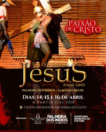 Após dois anos suspenso, por conta da pandemia da Covid-19, o espetáculo da Paixão de Cristo voltará a ser realizado na cidade de Palmeira dos Índios. Com o título: “Jesus, Rei dos Judeus”, a maior história de amor pela humanidade foi produzida, este ano, por um coletivo de atores independentes e dos grupos teatrais do município. O evento ocorrerá nos dias 14, 15 e 16 de abril, sempre às 20h, no Cristo Redentor, na Serra do Goiti, e será o único de toda a região.