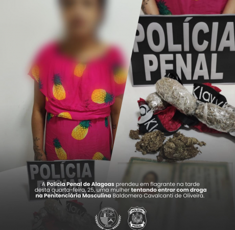 A Polícia Penal de Alagoas prendeu em flagrante na tarde desta quarta-feira, 25, uma mulher tentando entrar com droga na Penitenciária Masculina Baldomero Cavalcanti de Oliveira.