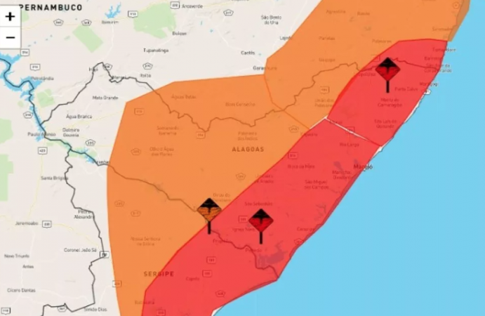 Já no litoral e na região do Baixo São Francisco, a previsão é de chuva superior a 60 mm/h ou maior que 100 mm/dia, ventos superiores a 100 km/h e grande risco de danos em edificações, corte de energia elétrica, de queda de árvores, descargas elétricas, alagamentos, enxurradas e grandes transtornos no transporte rodoviário.