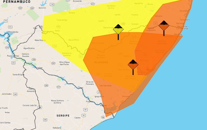 Nesta sexta (1º) o Instituto Nacional de Meteorologia (Inmet) emitiu um novo alerta de chuvas para Alagoas. O aviso, que é válido até o início da noite de hoje, comunica sobre o “Perigo” e “Potencial Perigo” de acumulado de chuvas em 75 municípios do estado.
